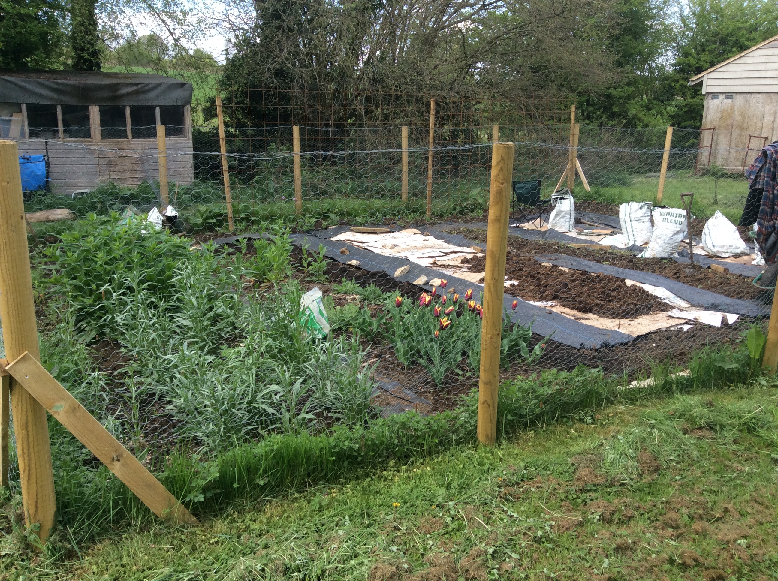 Last September when we started this we were duped by the ease of digging the first two beds. In the sun on a gentle, warm afternoon the soil was easy to dig. We didn’t realise that the rest of the plot was much heavier clay with dock roots going deep into the soil. Having dug beds by all the boundaries, the middle heavy (in parts blue clay) section was left. The thought of digging this was daunting and probably not feasible with the current demands at work, but just covering it with black plastic for any length of time was too ugly an option. So Sunday saw the laying down of clear paths with weed suppressant membrane and the covering of ‘soon to be beds’ with thick cardboard and later a layer of heavy mulch.