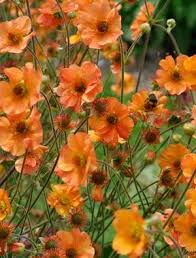 Geum ‘Totally Tangerine’ : a long flowering,  clump-forming, herbaceous perennial which produces an abundance of upward and outward facing, peachy-orange flowers from late Spring to Autumn. Carried on branched sprays, they rise well above the healthy mound of deep green, slightly fuzzy leaves. It is loved by pollinators and is a wonderful bullet proof plant. It tolerates part shade and flourishes in the clay soil in my garden