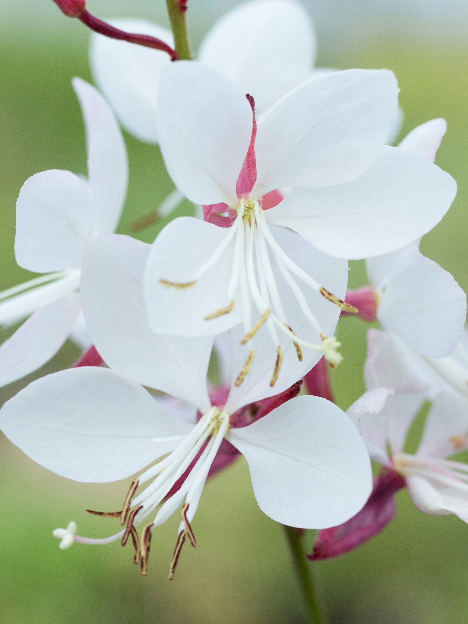Gaura Summer Breeze: delicate blooms open from pink buds into beautiful wafty spikes of beautiful 4-petalled flowers. Very attractive for cutting and also appreciated by bees, they flower abundantly the first year and continue over a long season. Despite their delicate appearance, Gaura are in fact very robust plants; they are particularly good in hot temperatures and are very drought resistant. They enjoy sun and a sheltered spot, but this variety is robust and suited to British weather. Grows up to around 3′ andneeds little care. Cut down in April.
