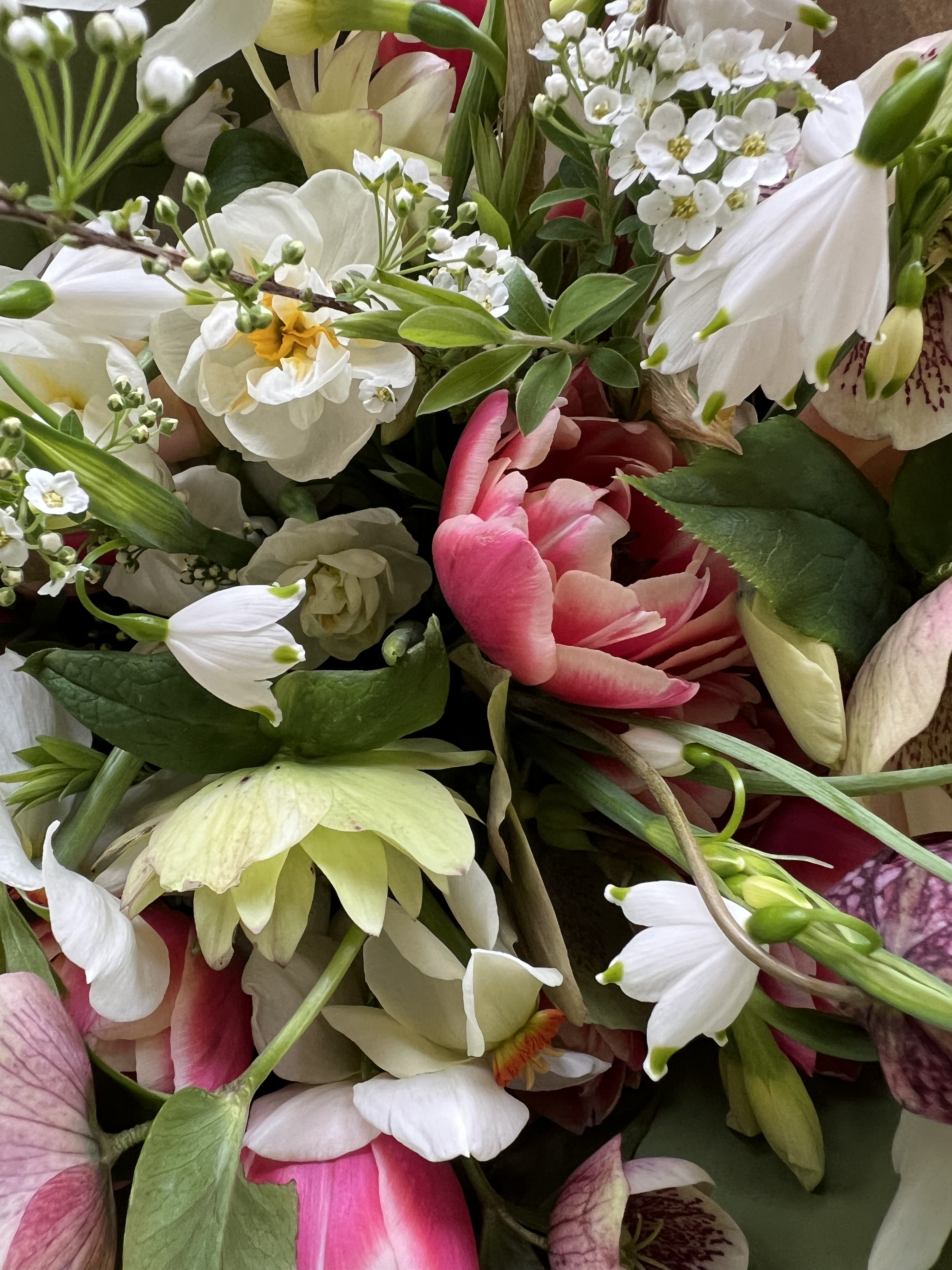 This week’s jam jars, pickle pots and bouquets will include: ranunculus, hellebores, delicately scented narcissi; anenomes in a range of colours; tulips as well as daffodils, fresh blossom and foliage.These bright and beautiful bouquets range from £15 to £25 and can be ordered gift wrapped or arranged in a vase. As a guide, each £15 bouquet will include at least 30 stems and often more.