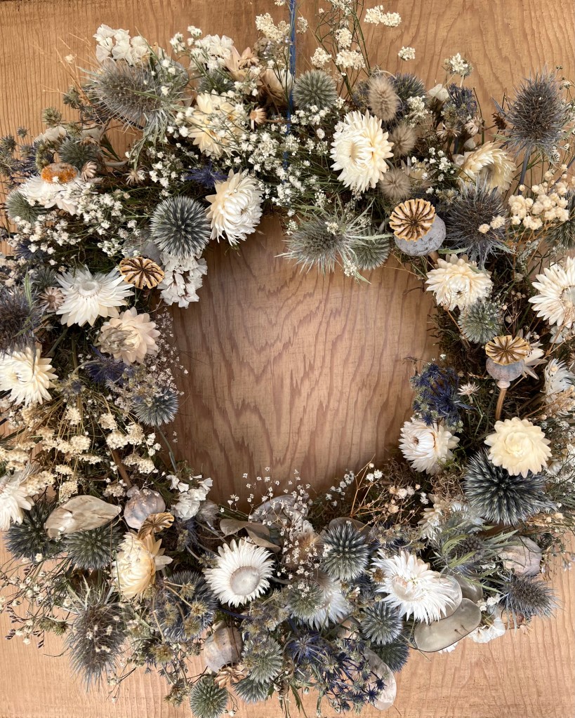 On damp days and dark nights wreath making goes on apace and the piles of dried summer flowers and foliage are getting lower. Some wreaths have already been carefully packed and posted while others are brightening up my walls waiting for markets. The images below are an example of what is currently available, but wreaths can be made to order with a colour palette chosen by you – just get in touch if you are interested. You can also pre-order fresh wreaths and buy make your own wreath kits – see below.