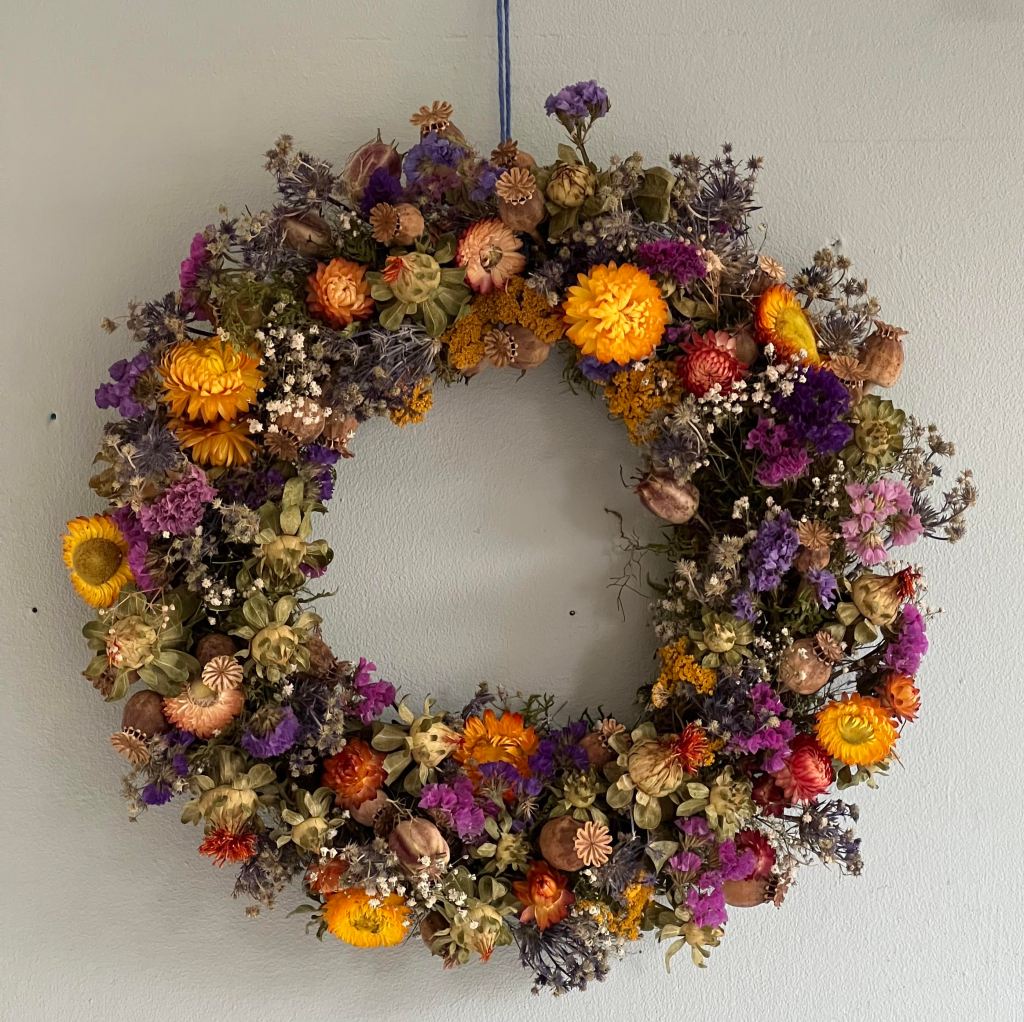 The flowers and foliage on these wreaths are grown (or foraged) and dried by me in a nature friendly way without the use of pesticides or herbicides.