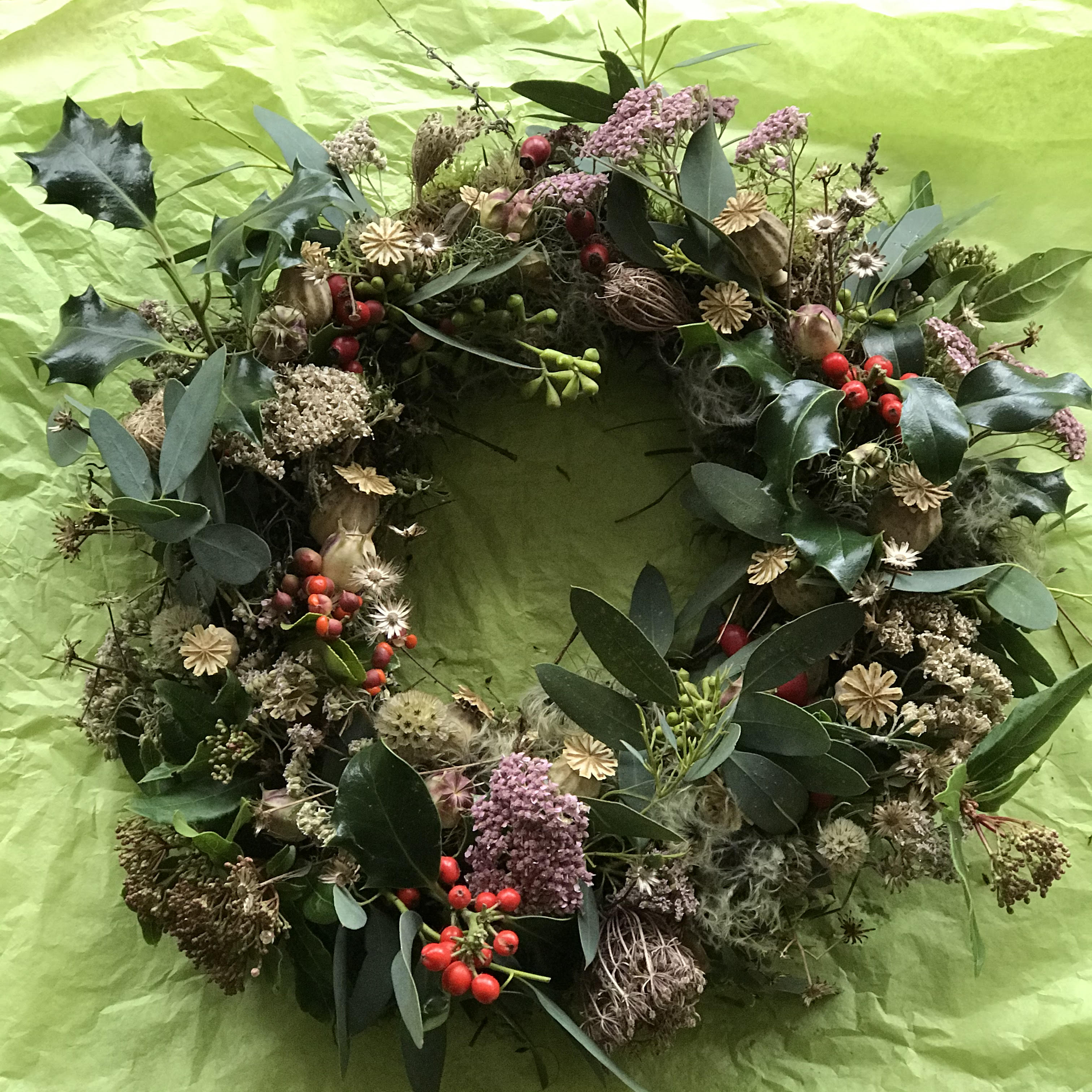 All fresh wreaths are made on a moss and wire (or handmade willow) base and are covered in layers of fresh foliage, berries and beautiful seedheads. Almost all the ingredients are from my plot and garden or are lightly foraged locally. If the moss is kept damp, the wreaths will last for weeks and weeks.