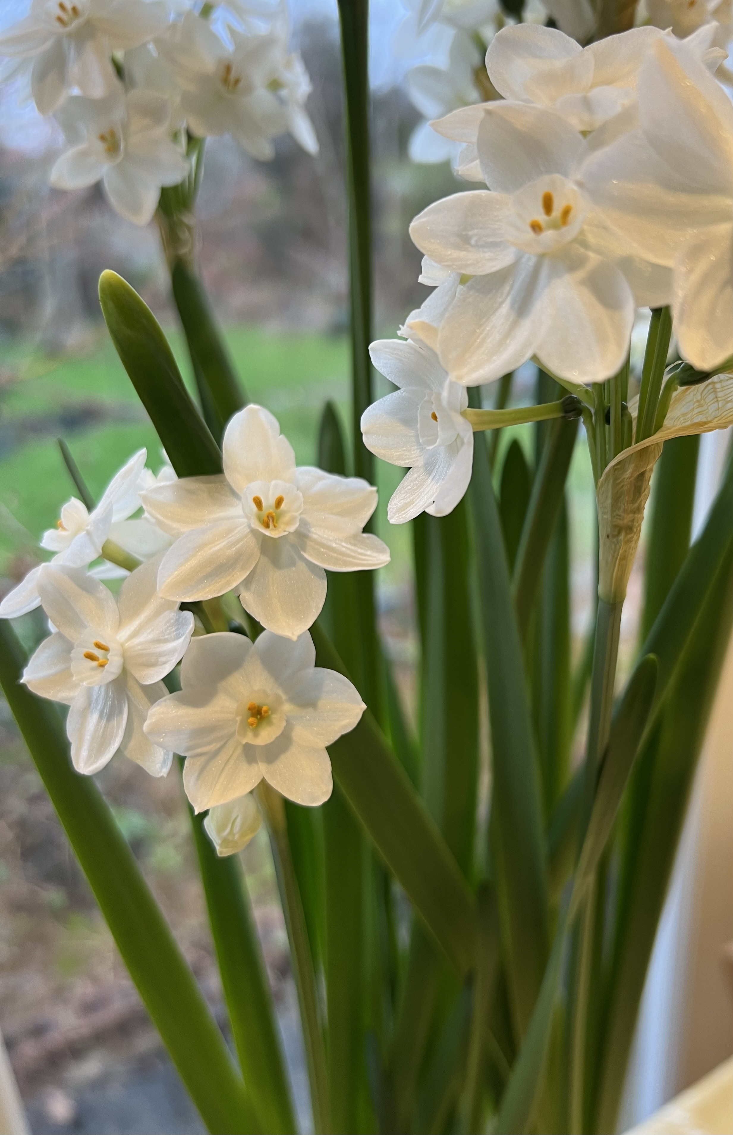 The last of the indoor narcissi are available in attractive metal containers or hurricane style glass vases.