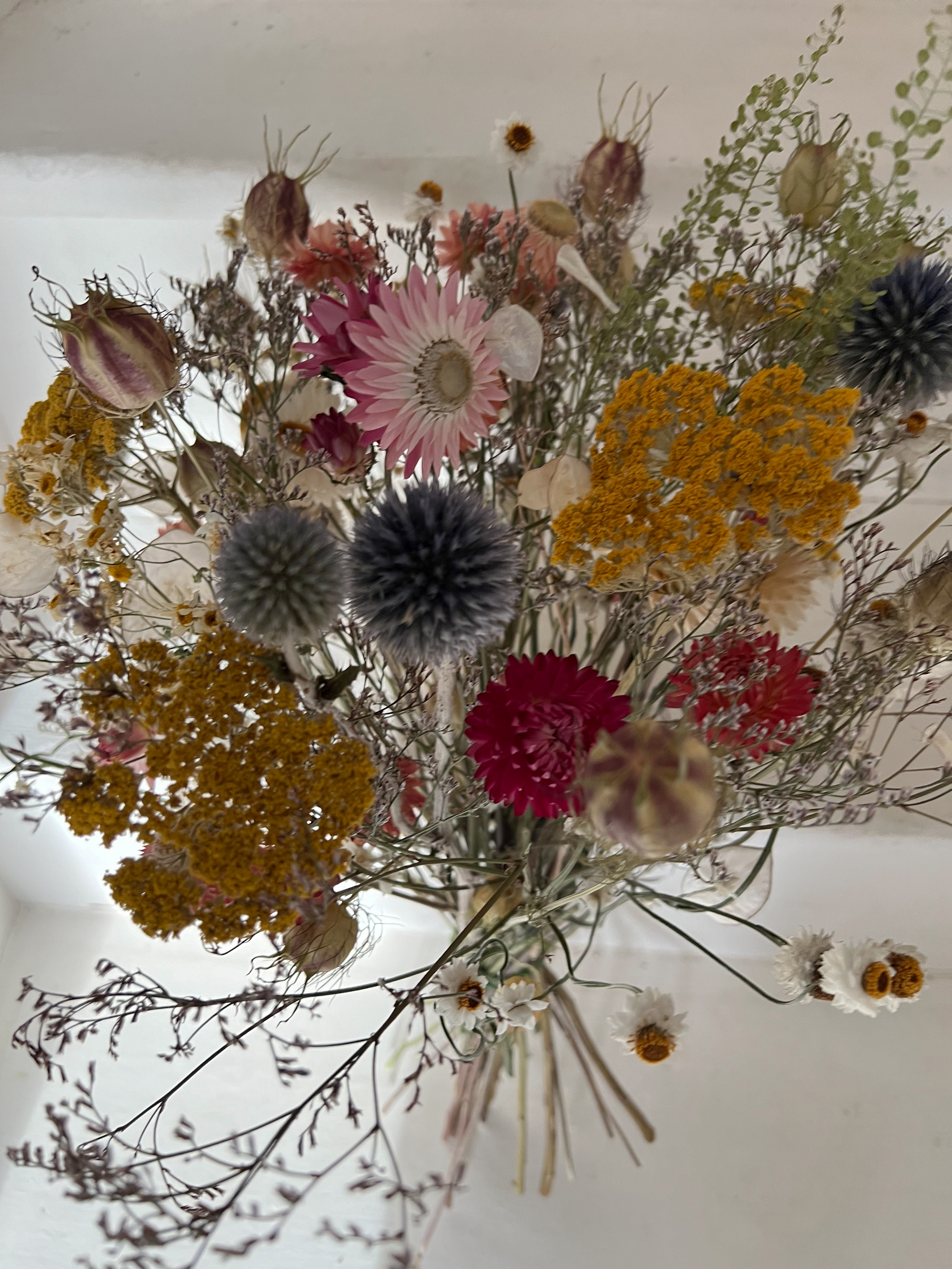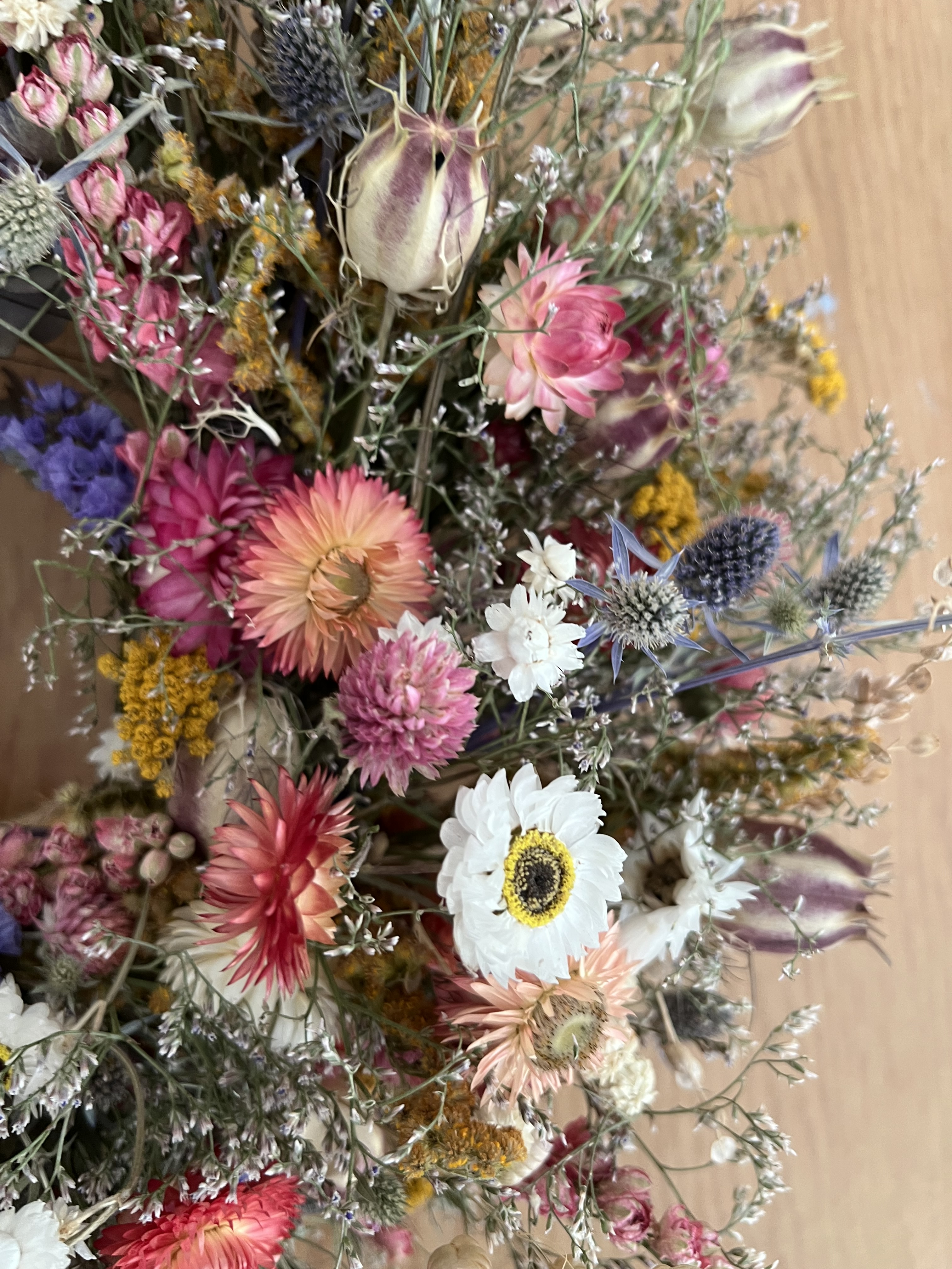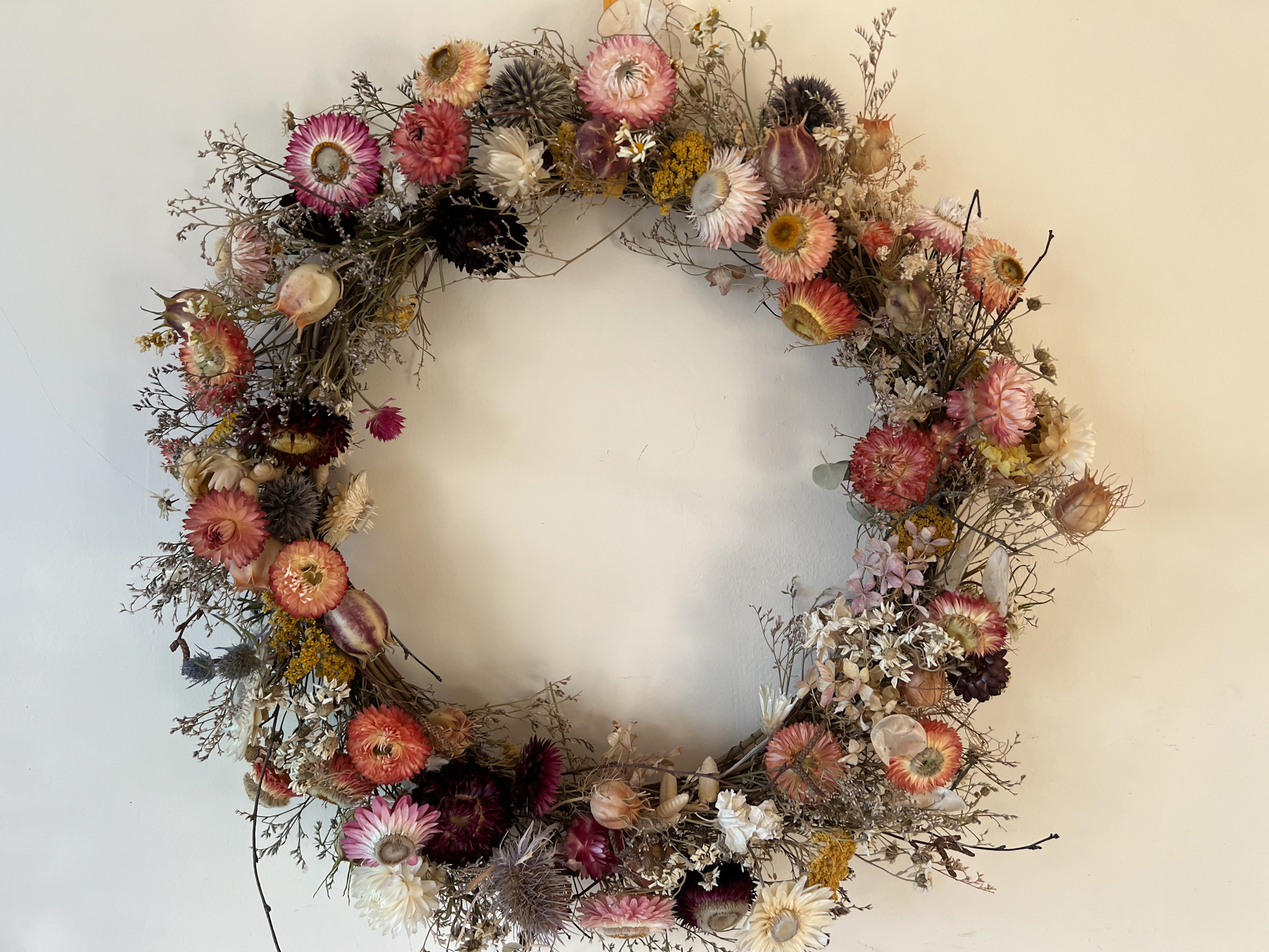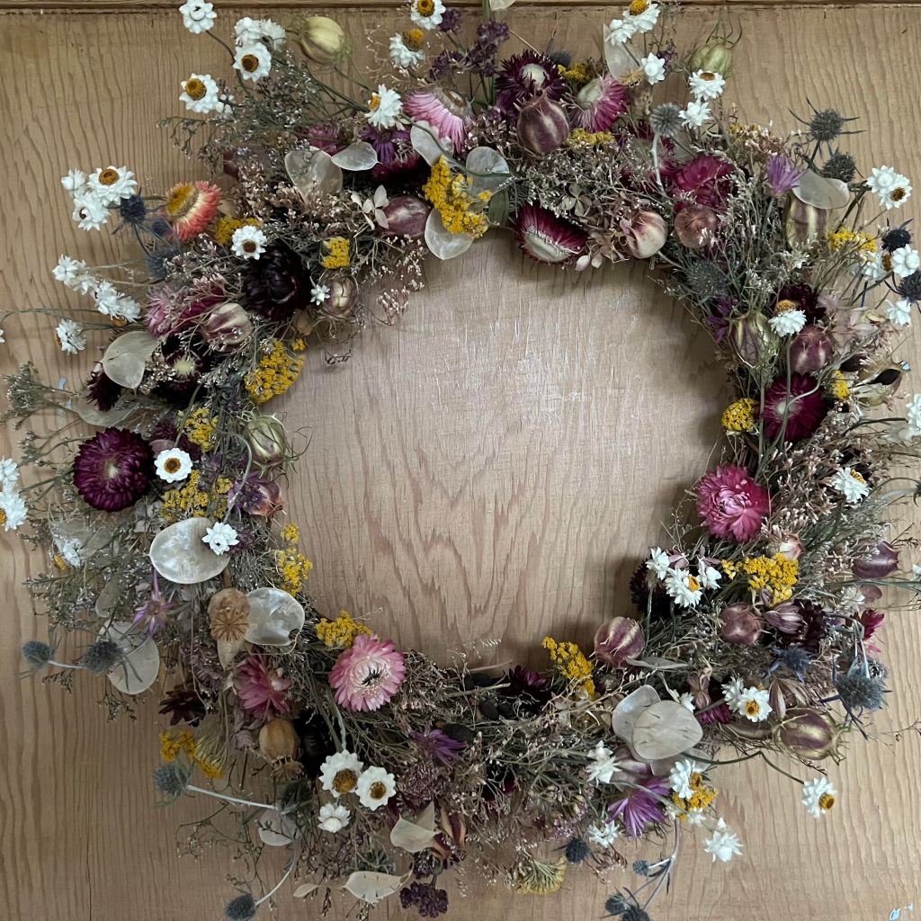 Each one of the wreaths is unique and made from flowers grown by me just outside Oxford using an organic approach and then dried naturally. The wreaths have a willow or vine base onto which generous handfuls of flowers are woven. These will last for years and years and keep their bright loveliness if kept in a dry place and out of direct sunlight.