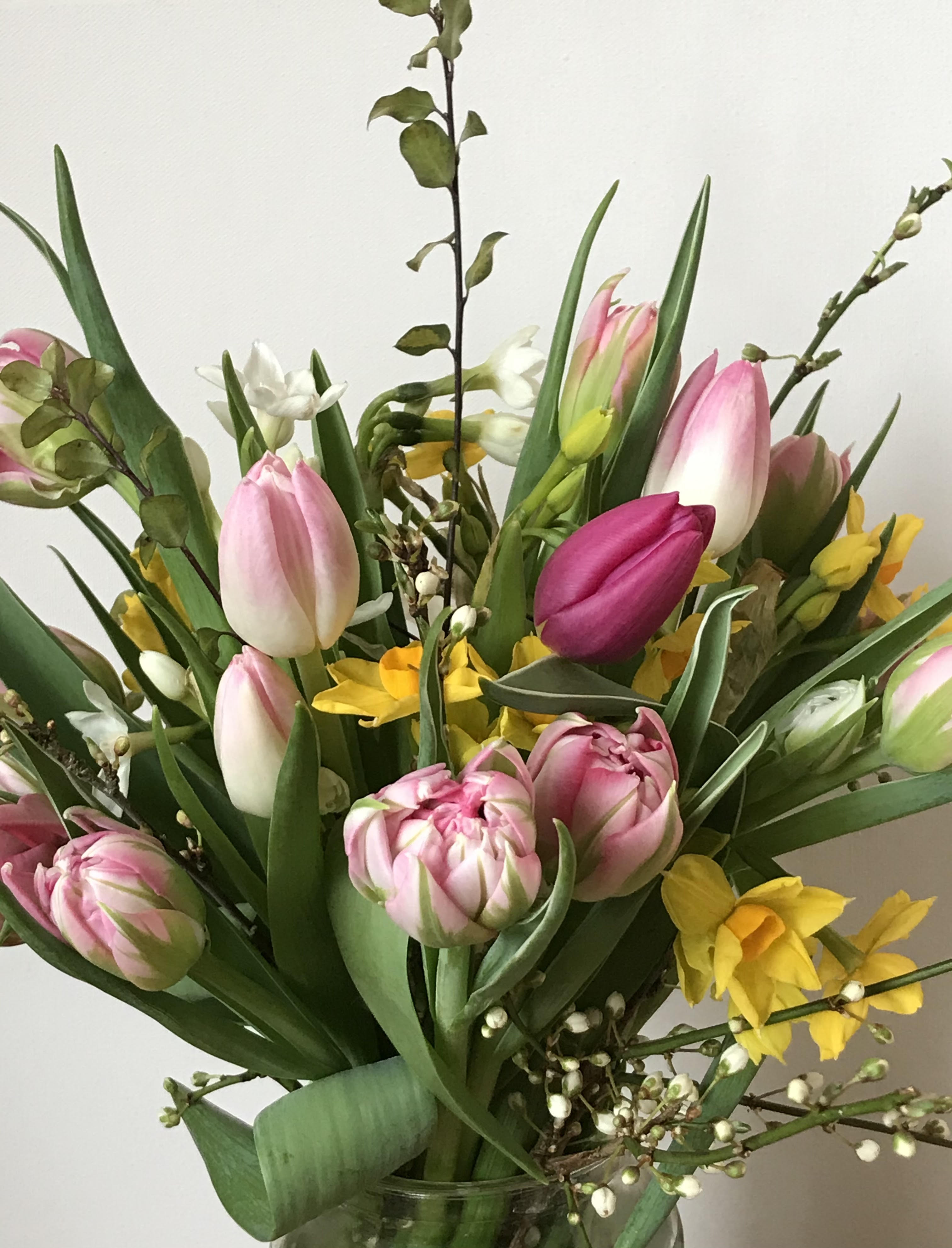 This week’s jam jars, pickle pots and bouquets will include: ranunculus,hellebores, delicately scented narcissi; anenomes in a range of colours; tulips as well as daffodils, fresh blossom and foliage.These bright and beautiful bouquets range from £15 to £25 and can be ordered gift wrapped or arranged in a vase. As a guide, each £15 bouquet will include at least 30 stems and often more.
