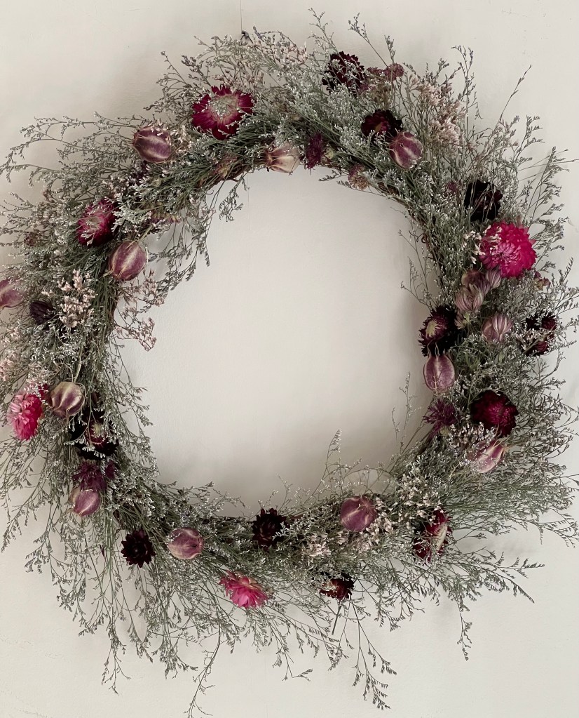 Grown by me using an organic approach and dried naturally, the flowers have as light an environmental footprint as possible. Each wreath is individual and made on a vine base (30 cms) to which layers and layers of beautiful dried material are added. If kept out of bright sunlight in a dry place, these wreaths will last for years and keep their bright loveliness