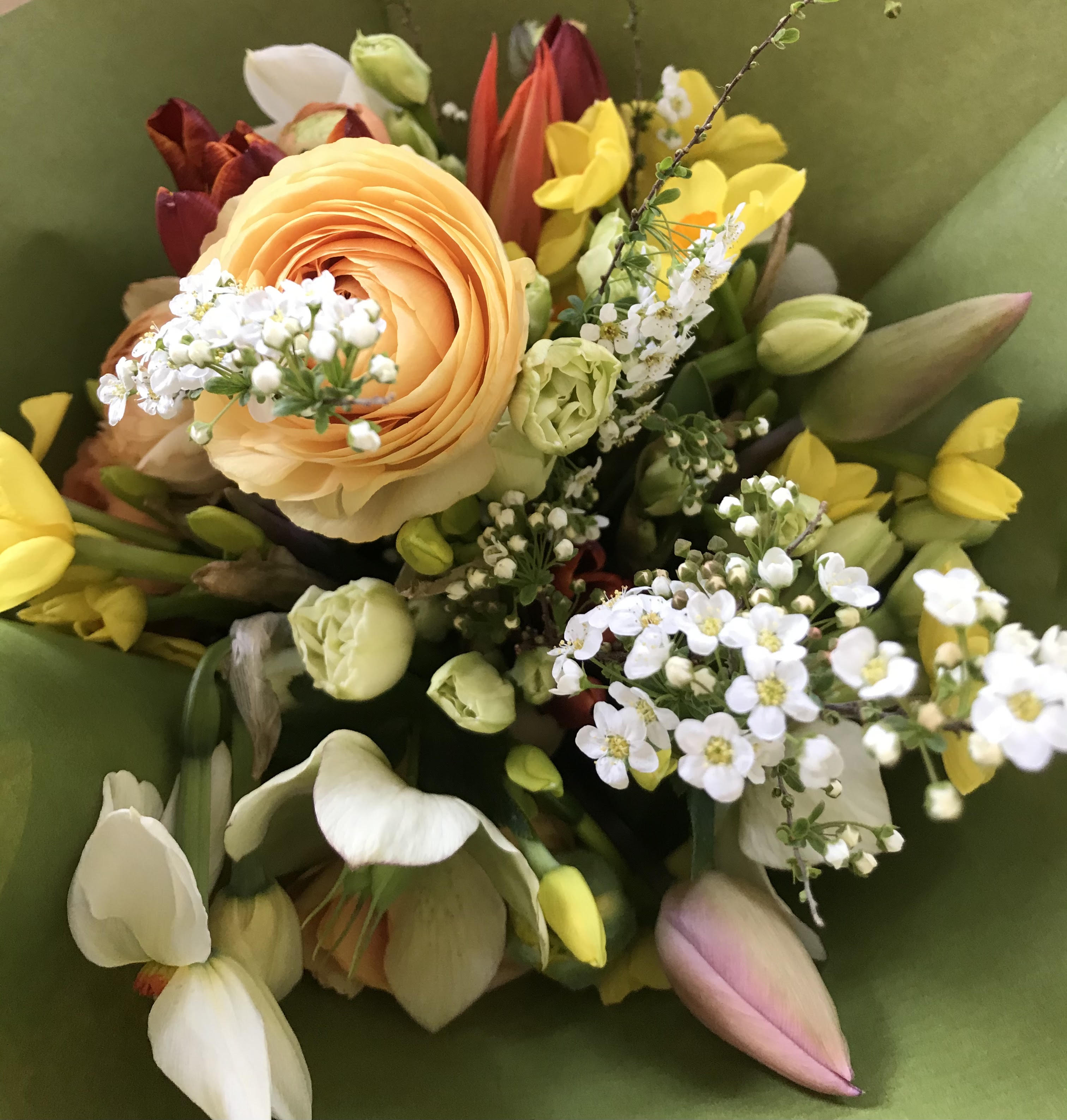 Flowers this week include: the last of the tulips, ranunculus, alliums, geums, honesty and blossom.